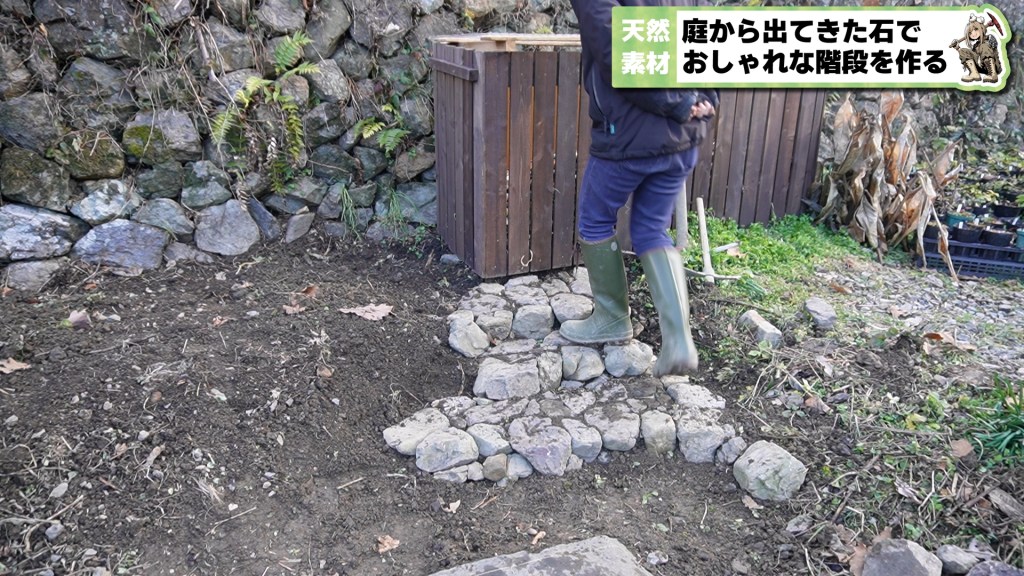 今はまだ土が見えていて殺風景かもしれませんが、これから隙間に植物を植えたり、緑が入ってきたりすることで、より自然なロックガーデンへと進化していきます。これで毎日のコンポスト作業も、滑ることなく快適に行えますね。